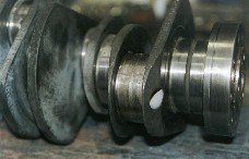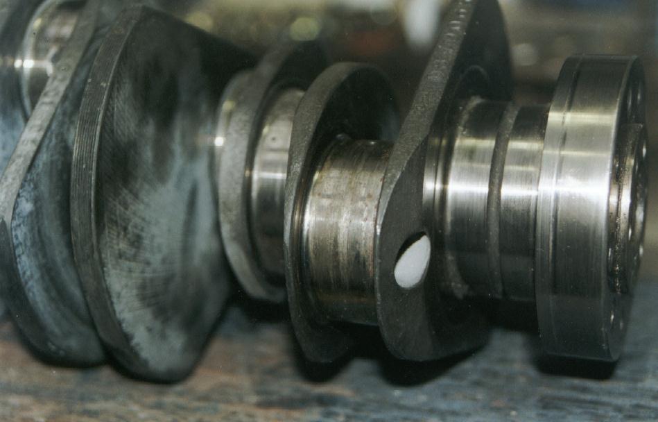 When I purchased the car, the engine was completely striped down, and examination of the crank shaft revealed a deepscore where the #6 big end bearing had disentigrated, which turned out to be the reason for the rebuild. The bearing had worn paper thin and was "grabbing" the crank. Machining the crank was attemped but the damage was too great. With 911 crankshafts, once the hardened outer surface is penitrated, the metal becomes very soft. This necessitated sourcing a second hand crank shaft. Examination of the other dismanted parts revealed that 2 pistons had cracked shirts (see pic below), and another one was under weight. To do the job properly meant replacing all pistons and barrels. Crack testing also revealed one of the conrods needed replacement.
