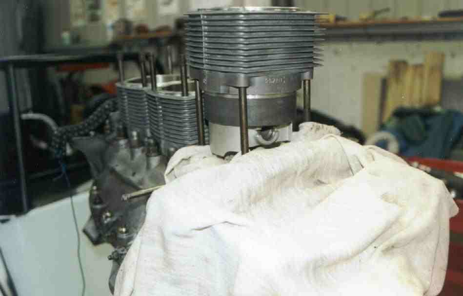 The pistons and barrels went on next. There are a number of ways the pistons and barrels can go on, but I chose to assemble the pistons, rings and barrels on the work bench, with the pistons pushed down the barrel with the pin holes exposed at the bottom. It was a relatively simple task the then align the pistons in the correct direction and insert the rod pin and clips. Ensure that you stuff plenty of rags down all of the open holes in the case, as anything that drops down there will be a real pain to get out.